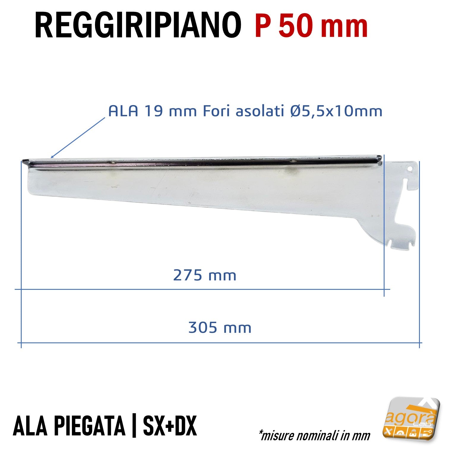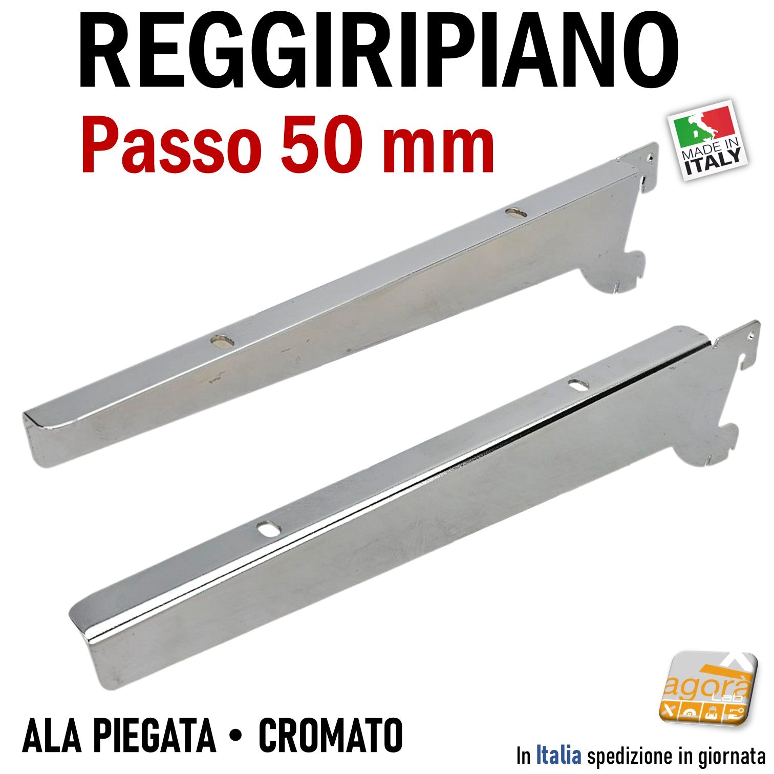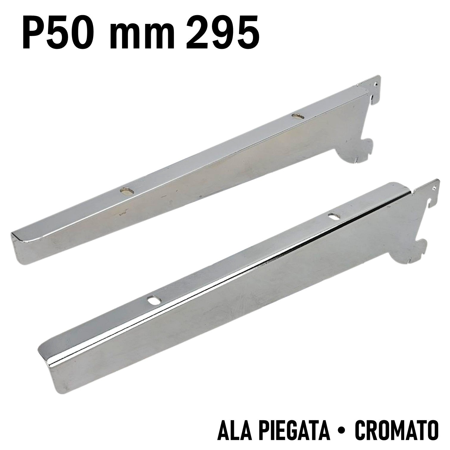 Art.115583 REGGIRIPIANO PER NEGOZIO ATTACCO CAVETTATO PASSO 50MM CROMATO ALA PIEGATA SUPPORTO MENSOLA 30CM