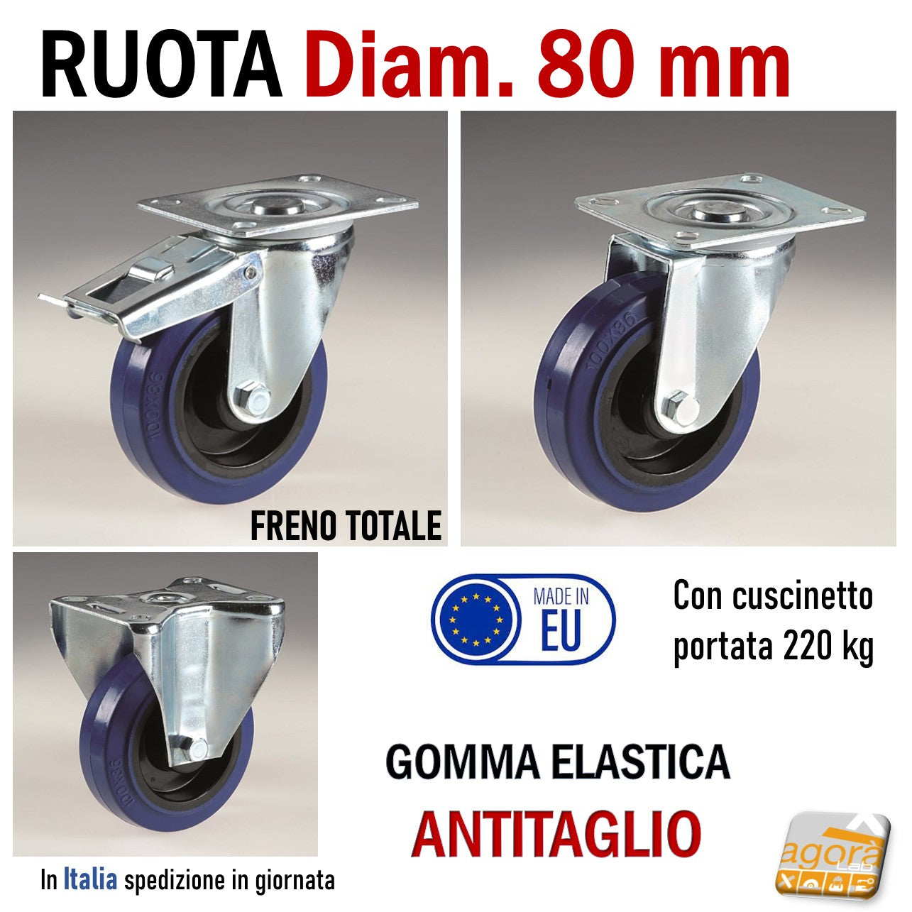 RUOTA GOMMA ELASTICA BLU D80MM GIREVOLE CON PIASTRA 100x80 CON FRENO SENZA FRENO INDUSTRIA RUOTE CARRELLI