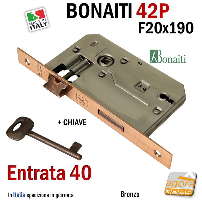 • SERRATURA PORTA FRONTALE 20x190mm RETTANGOLARE E40 I70 BONAITI 42P BRONZO PATENT PICCOLA +CHIAVE