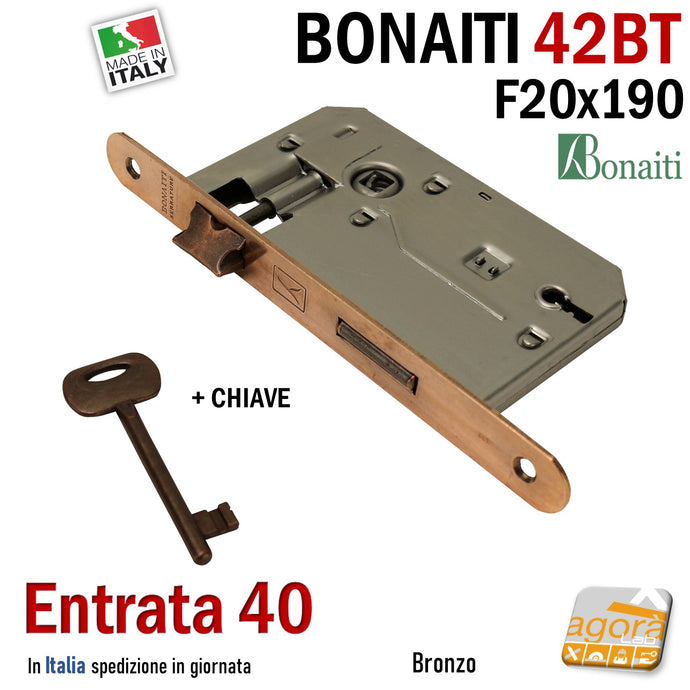 SERRATURA PORTA FRONTALE 20x190mm TONDO E40 I70 BONAITI 42T BRONZO PATENT PICCOLA con CHIAVE