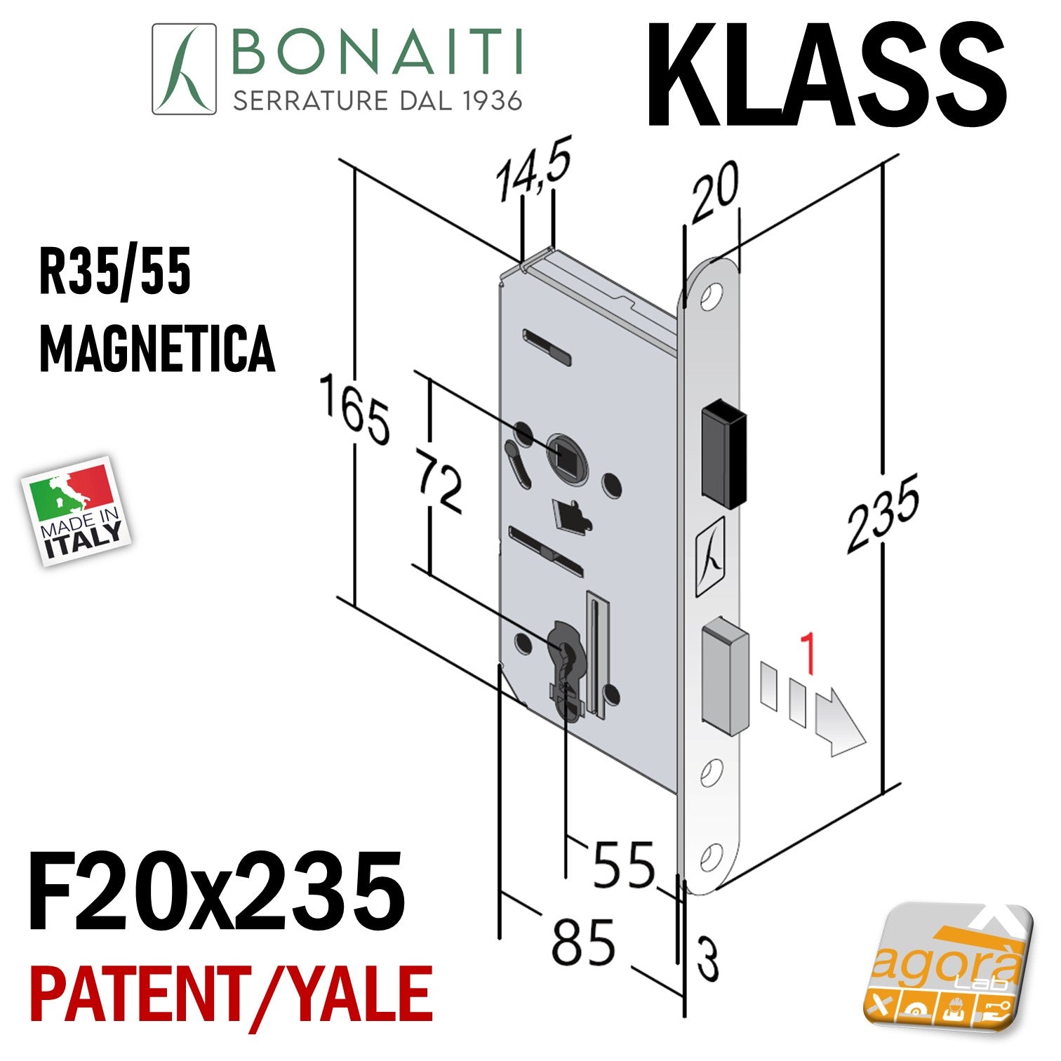 SERRATURA PORTA MAGNETICA KLASS BONAITI R35 FRONTALE 20X235MM E55 I72 CHIAVE YALE entrata 55mm intrasse 72mm R35/55 CHIAVE  frontale 235 x 20 mm