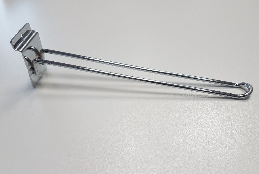 Art. 105522 Hook in chromed wire Double blister holder Diameter 6 mm (external distance between wires 31mm approx.) Length 30 cm slatted connection (compatible with most of the slatted walls both in plastic and in aluminum)