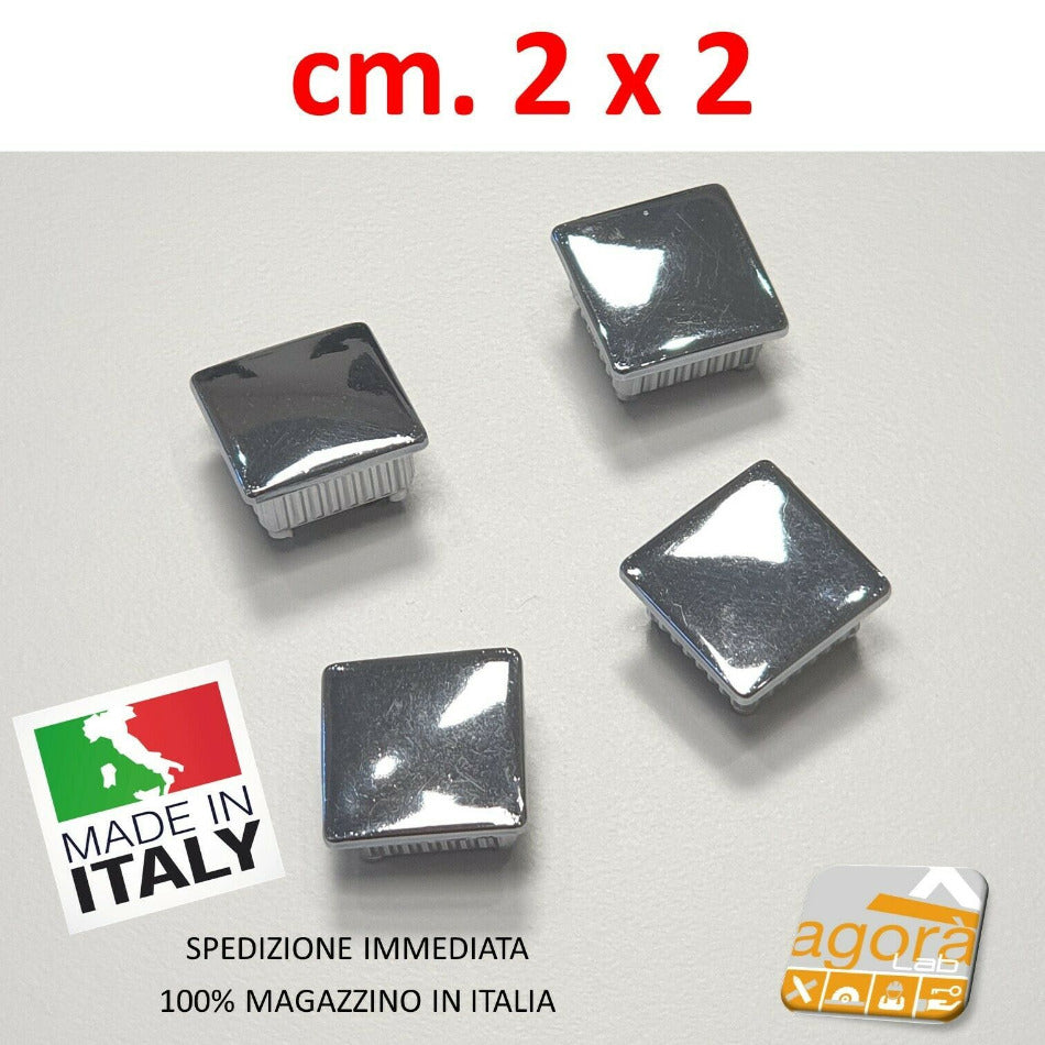 Cap for 20x20 mm square tube. In chromed ABS, slightly rounded head suitable as a visible finish for 20x20 tubes. The special knurling allows it to be easily inserted and prevents the cap from coming out of its seat. Does not require glue.