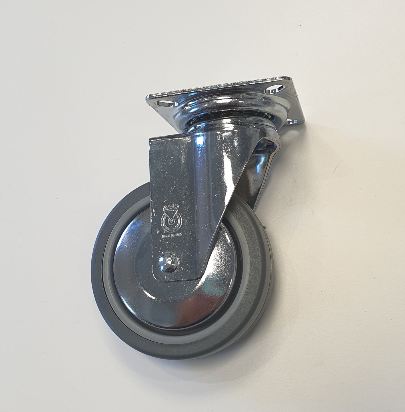 Pressed steel support rotating on double ball crown with wheel locking device. Polished chrome finish. Gray synthetic rubber wheel flanged in thermoplastic with polished chrome-plated pressed steel thread guards.