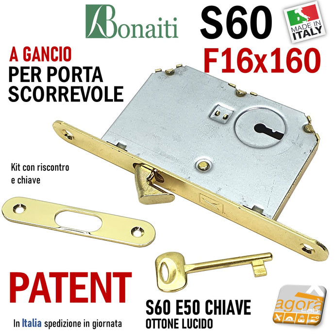 SERRATURA PORTA SCORREVOLE GANCIO FRONTALE 16x160mm BONAITI 60/30 OTTONE LUCIDO PATENT +CHIAVE +INCONTRO ENTRATA 30MM