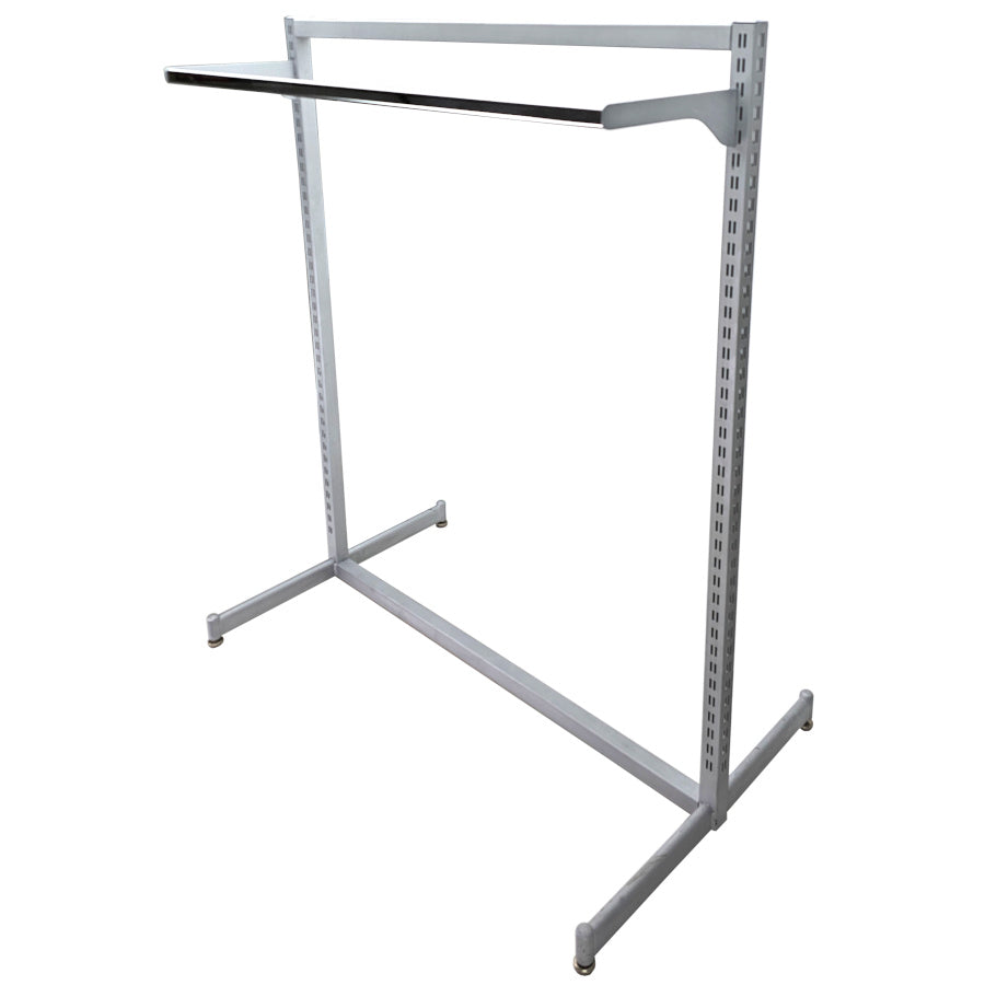 Gondola autoportante Stender Espositore per abiti e negozi di abbigliamento in metallo verniciato grigio goffrato attrezzabile con barre appenderia, barre aderenti porta ganci porta broche, ganci portablister, ripiani in legno o in vetro.
