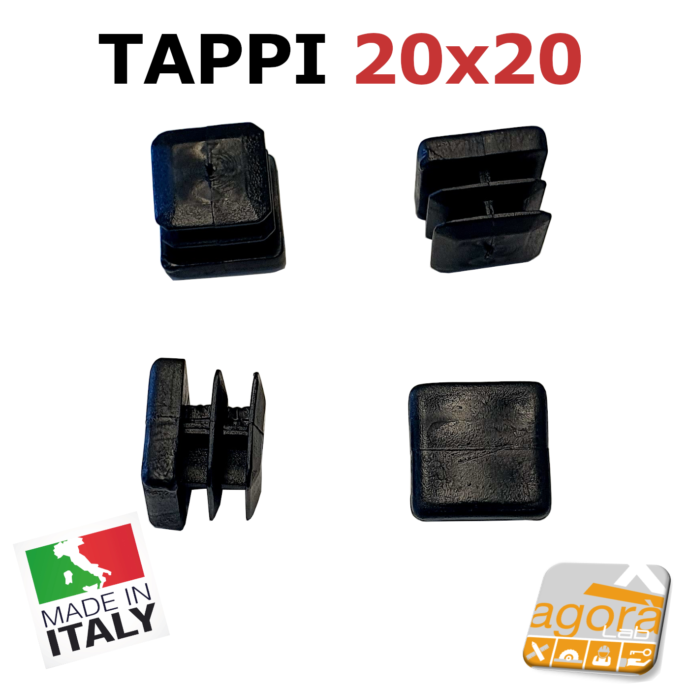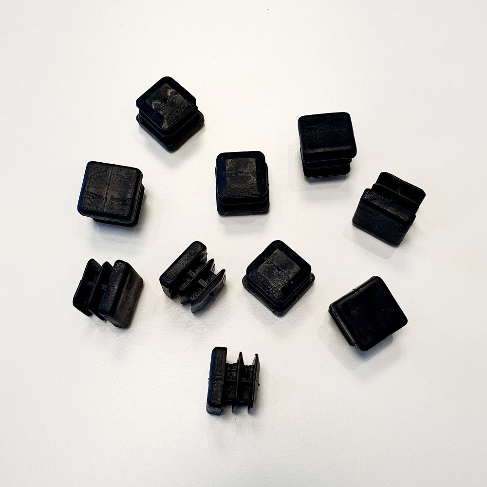 Tappo per tubolare quadrato   20x20 mm. Di colore Nero rifinisce la testa del tubolare e grazie alle alette rimane incastrato senza bisogno di colla o altro.  Può essere usato anche come puntale/piedino per tavoli, strutture etc