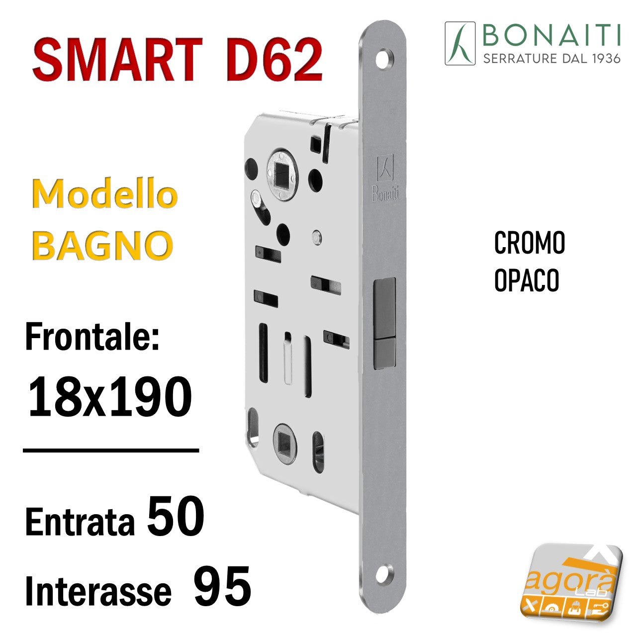 Art.115868 SERRATURA PER PORTA B-SMART BONAITI BAGNO F18X190 Modello D62 CROMO OPACO (ARGENTO) E50 INT.95