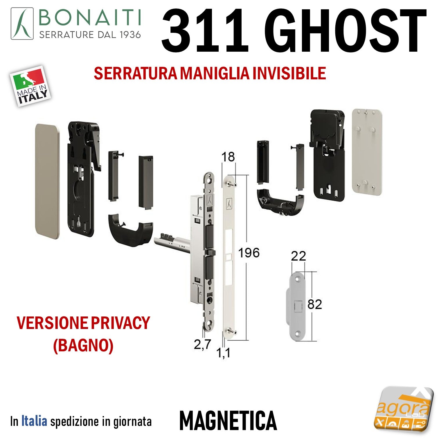 serratura porta bonaiti ghost privacy 311 gf42 invisibile maniglia a filo b no-ha frontale 18x196 bagni contropiastra magnetica 82x22