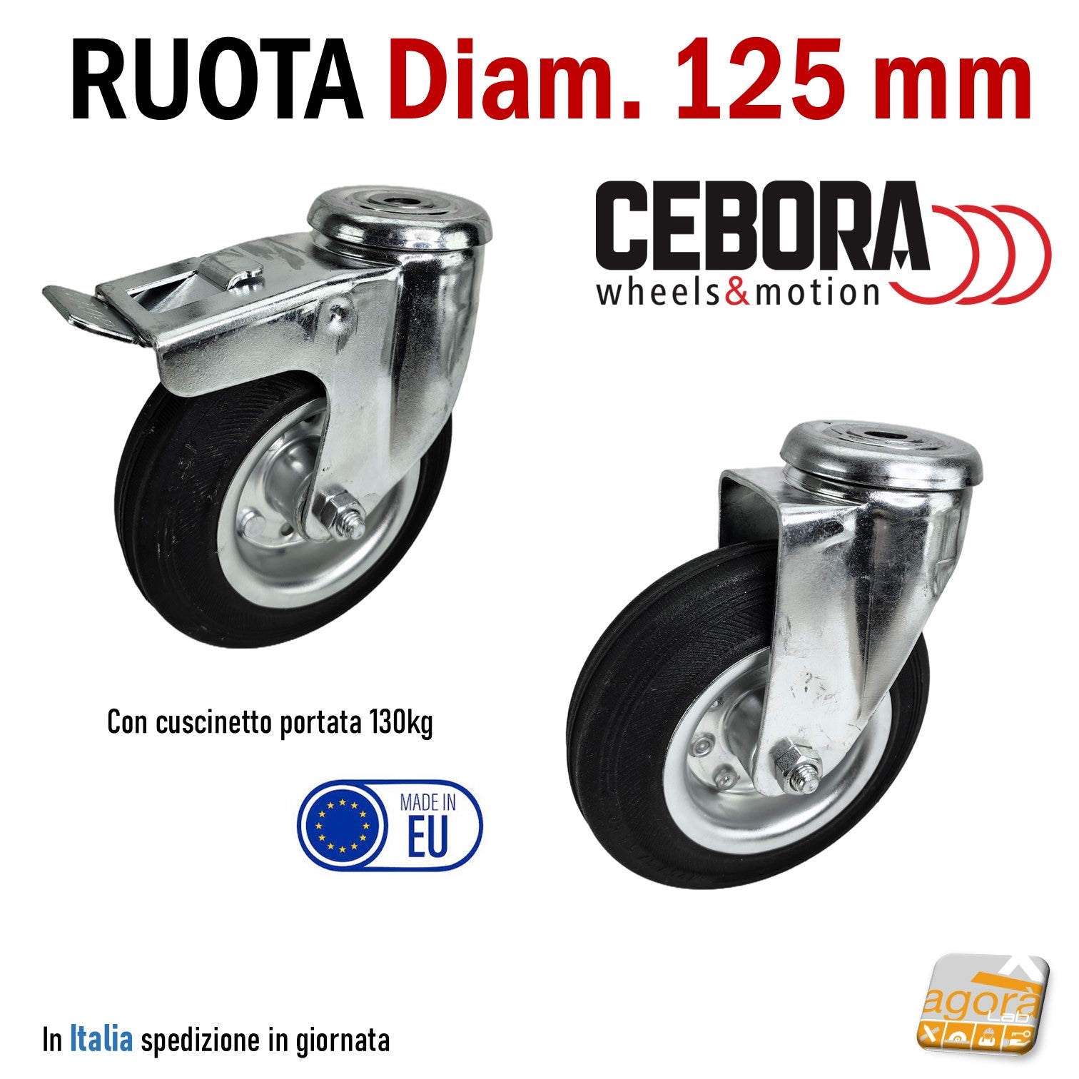 RUOTA GOMMA NERA D 125MM GIREVOLE CON PERNO PASSANTE CON FRENO SENZA FRENO CEBORA INDUSTRIA RUOTE