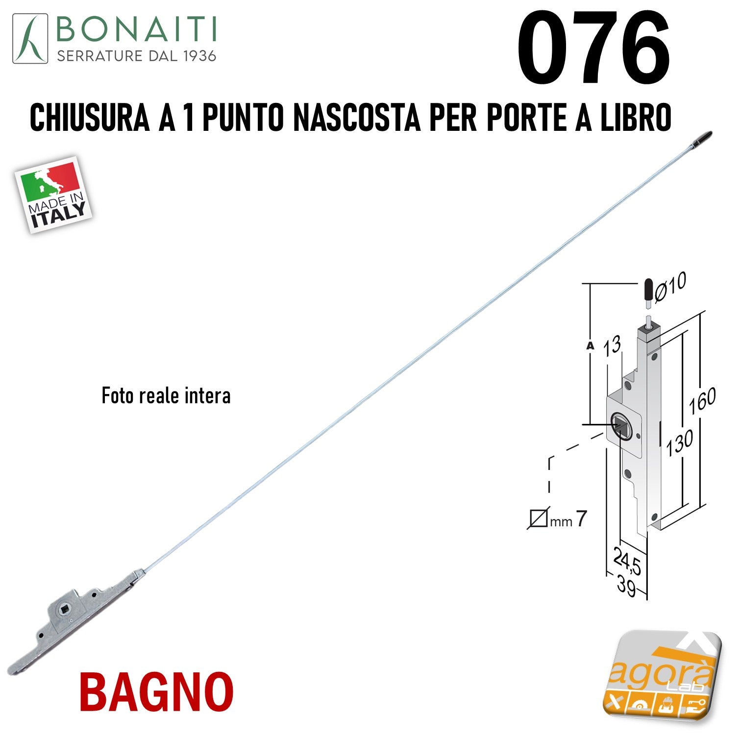SERRATURA per PORTA A LIBRO BONAITI 076 CHIUSURA 1 PUNTO NASCOSTA BAGNO QUADRO 7X7 160MM corpo 130 ENTRATA 24,5 25 COMPLETA DI ASTA FILETTATA 923MM 90CM mod.076 47076000F1 Q7 160x39mm perno Ø10mm D10