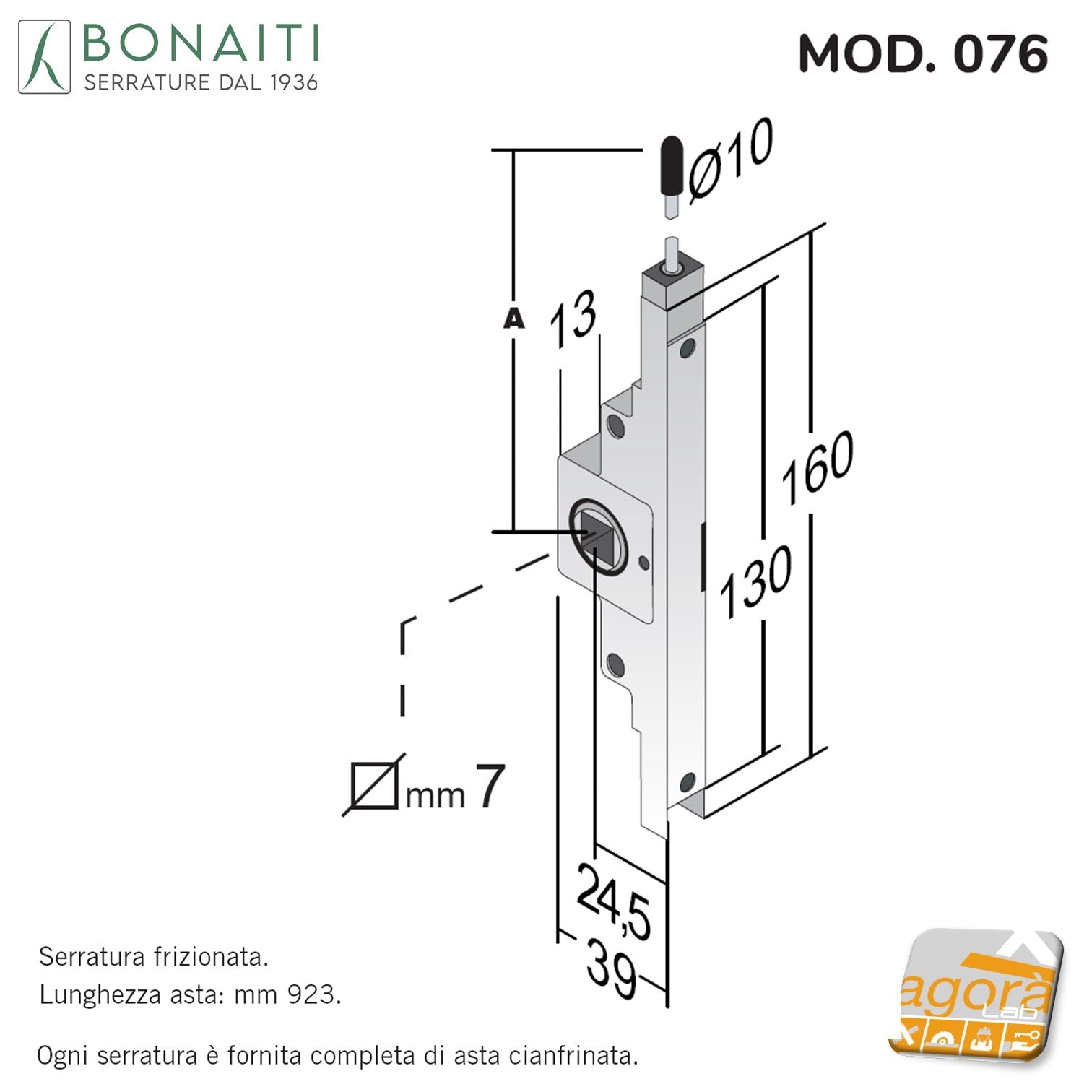 SERRATURA PORTA A LIBRO BONAITI 076 CHIUSURA 1 PUNTO NASCOSTA QUADRO 7X7 160MM corpo 130MM ENTRATA 24,5MM 25 CON ASTA FILETTATA 923MM 90CM mod.076 47076000F1 Q7 160x39mm perno Ø10mm D10