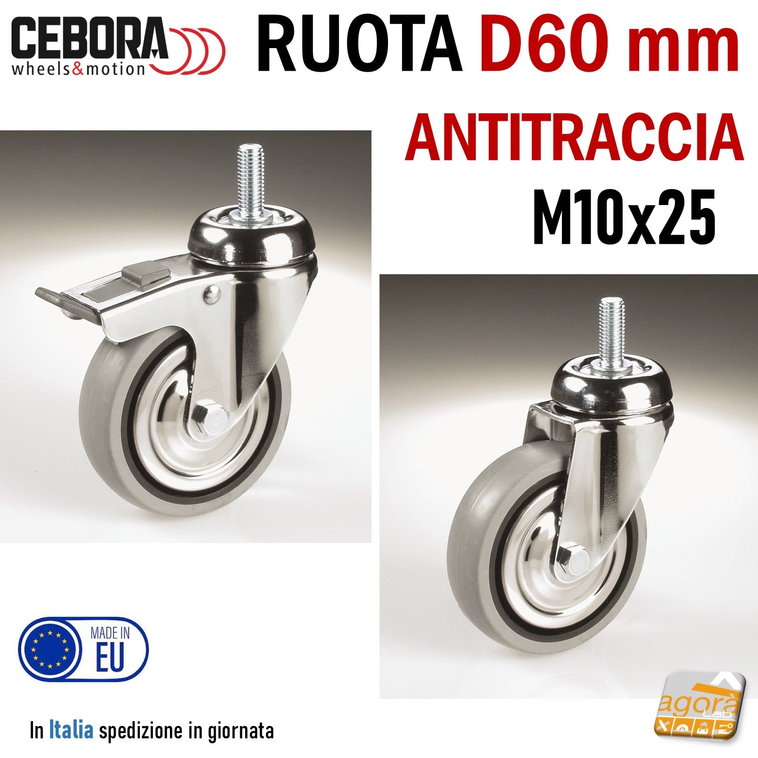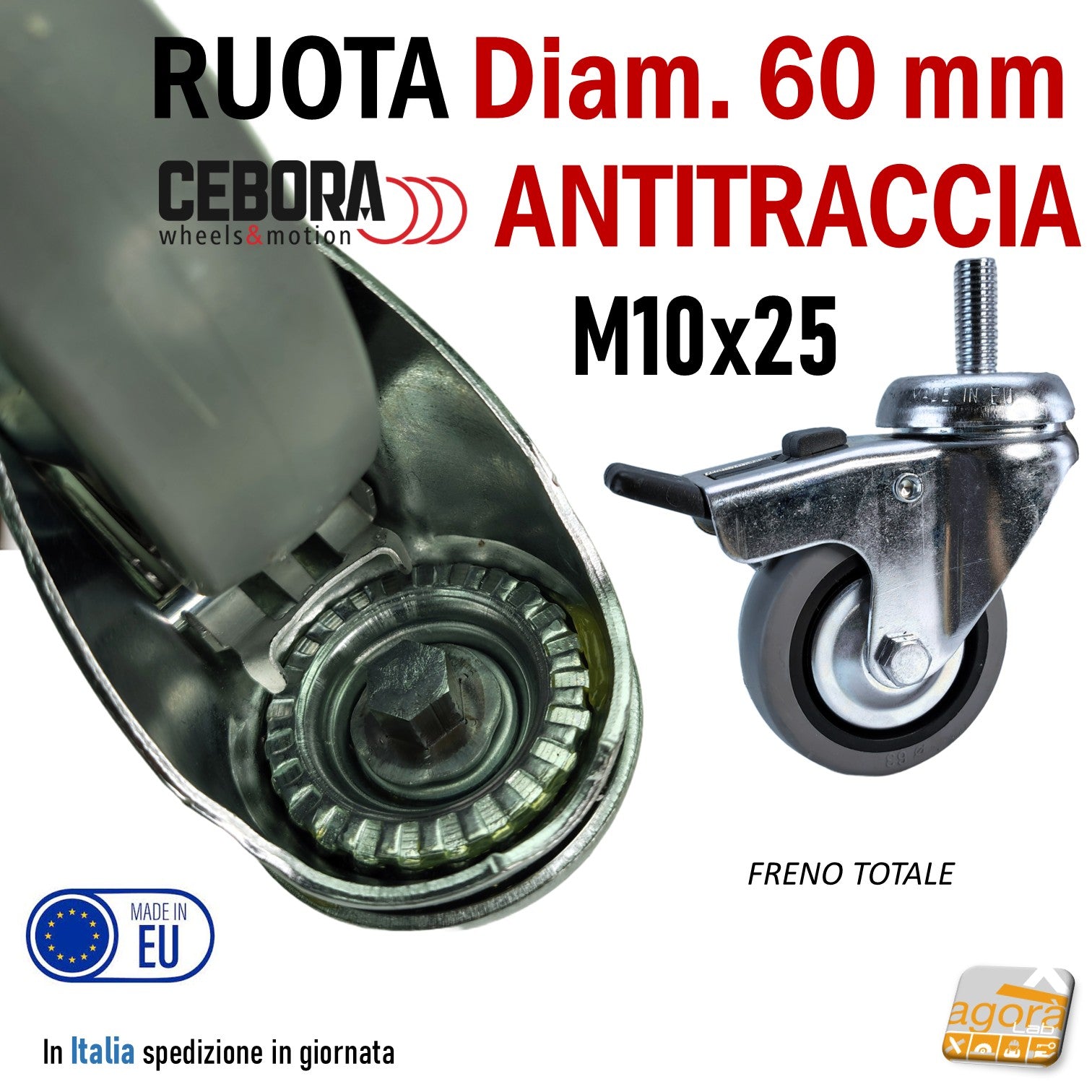 Art.115771-115772 RUOTA D60MM (63mm) GRIGIA CON PERNO FILETTATO M10 X 25MM ZINCO-CROMATA CON FRENO - SENZA FRENO CEBORA