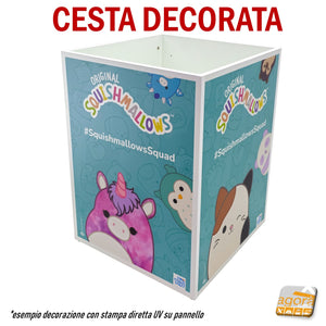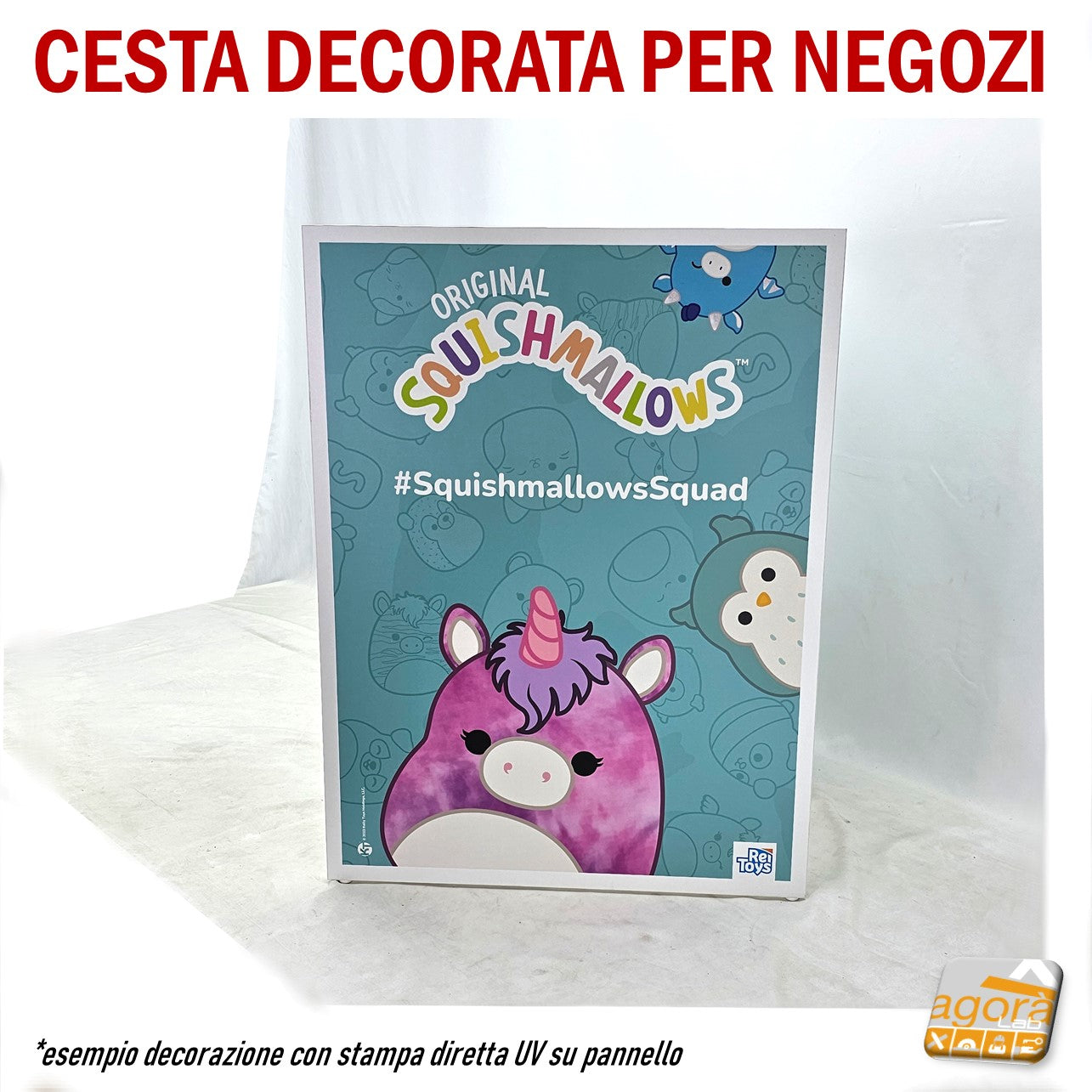 BANCARELLA CESTA ESPOSITORE CESTONE PER NEGOZI CHIUSA ANTICADUTA SU MISURA E DECORABILE decorati pubblicità loghi decorati stampati uv per negozi