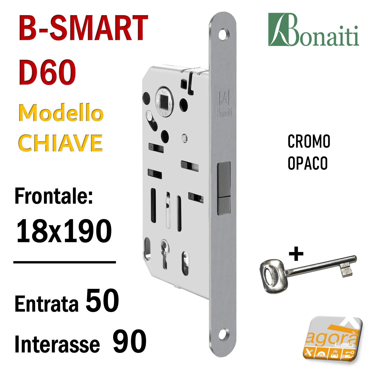 SERRATURA PORTA MAGNETICA B-SMART BONAITI D60 CHIAVE PATENT FRONTALE 18X190MM E50 I90 CROMO OPACO