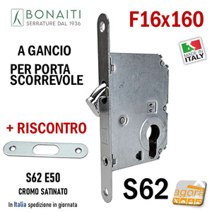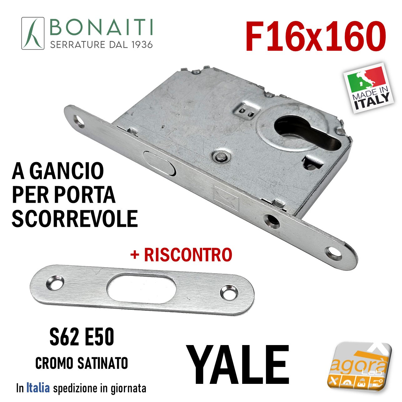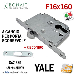 SERRATURA GANCIO PER PORTA SCORREVOLE BONAITI S 62/50 F16X160 YALE CROMO SATINATO COMPLETO DI INCONTRO 4006205087 62-50 ENTRATA 5CM FRONTALE 16CM CROMATA SATINATA PER CHIAVI DIVERSE